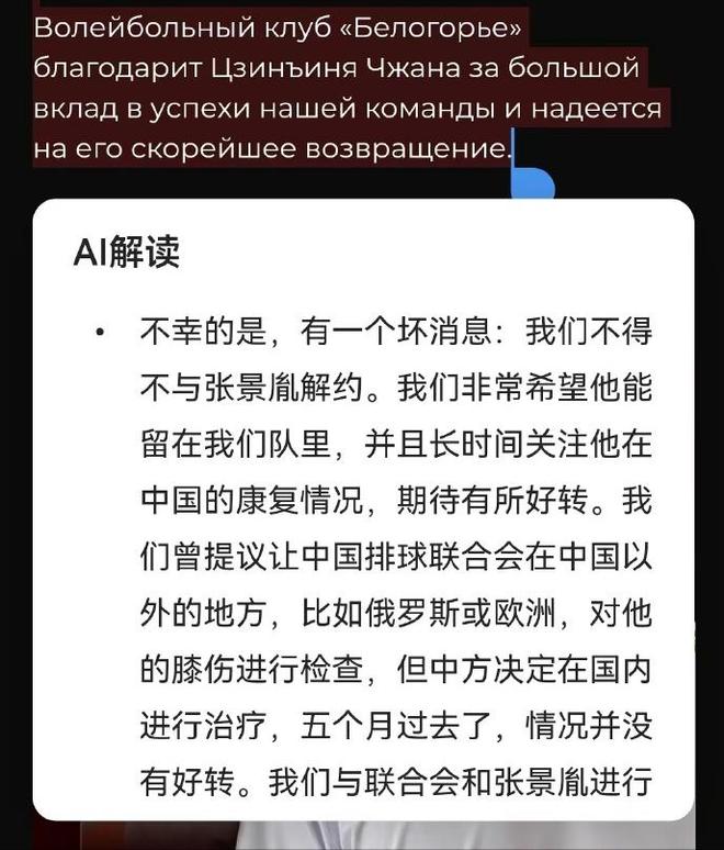 中国男排当家主攻张景胤,被俄罗斯超级俱乐部别尔哥罗德解约。这个消息是别尔哥罗德通过社会媒体发布的。之所以选择在俄罗斯超级联赛开始前宣布,是因为张景胤的伤势无法恢复,所以球队不得不选择新的外援。